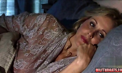 Blonde dressed in sexy delicates Sarah Vandella guzzles a giant black penis