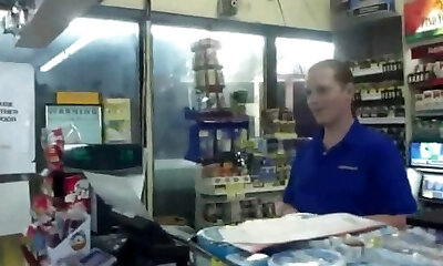 Sandy demonstrating and sucked by a clerk